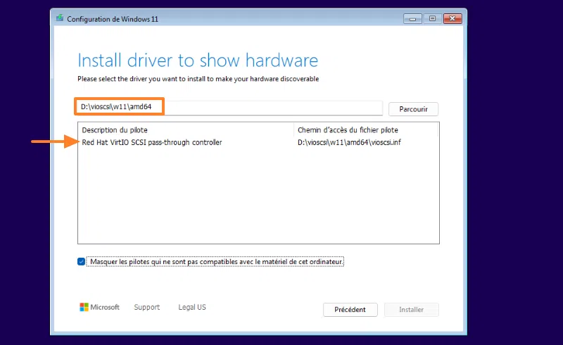 Cliquez sur le bouton "Parcourir" puis dans le lecteur DVD correspondant à l'image ISO VirtIO, sélectionnez le dossier D:\vioscsi\w11\adm64. Validez. Un pilote nommé Red Hat VirtIO SCSI pass-throuth controller devrait s'afficher. Sélectionnez-le et cliquez sur le bouton "Installer".