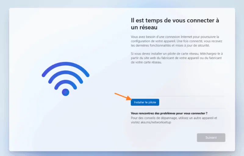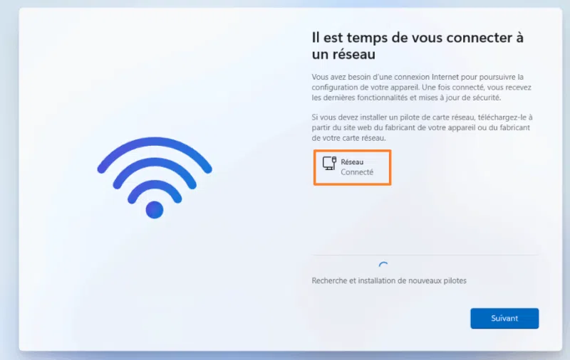 L'installation va débuter et poursuivre... Vous allez enchainer les étapes et vous retrouver bloqué sur l'étape de connexion au réseau ! La carte réseau ne sera pas reconnue, là encore à cause d'un problème de pilote. Cliquez sur le bouton "Installer le pilote", sélectionnez le lecteur VirtIO et validez (Windows va rechercher le pilote tout seul).
