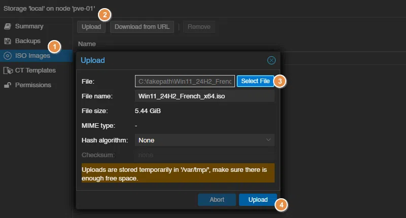 L'image ISO doit être chargée dans la bibliothèque d'image ISO de votre serveur Proxmox.