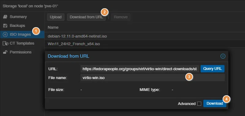 Ici, nous prendrons la version stable (mais les deux fonctionnent) pour des raisons de stabilité. Toujours à partir de votre PVE, lancez le téléchargement de l'image ISO des pilotes VirtIO :