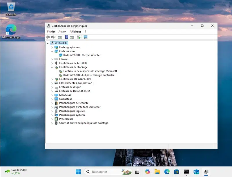 Si vous jetez un œil à la liste des périphériques, vous constaterez la présence des périphériques VirtIO. C'est aussi l'occasion de voir si des pilotes sont manquants.