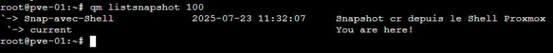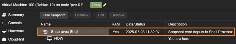qm snapshot 100 Snap-avec-Shell --description "Snapshot créé depuis le Shell Proxmox" --vmstate true