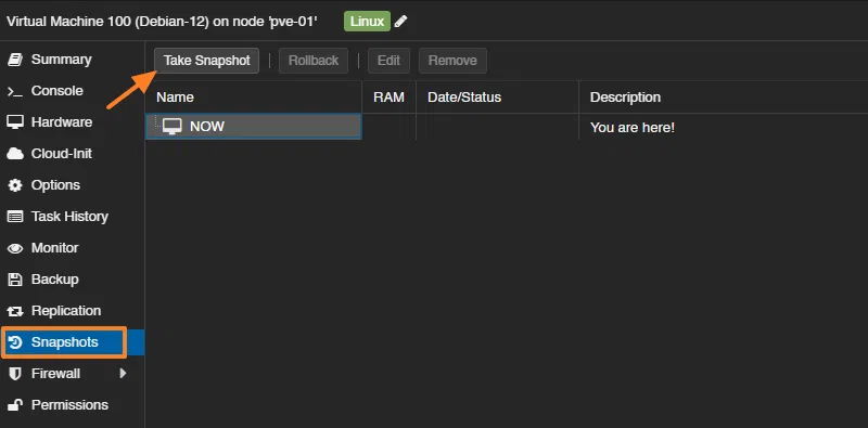 Pour commencer, nous verrons comment créer, modifier, restaurer et supprimer un snapshot à partir de l'interface web (GUI) de Proxmox VE. Ce sera l'occasion de voir la mécanique de fonctionnement des snapshots en prenant un exemple.