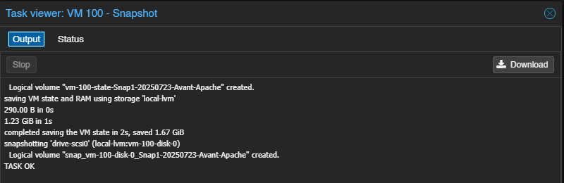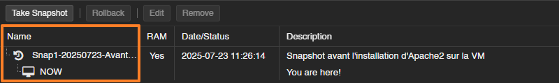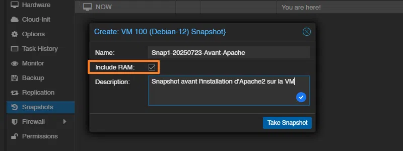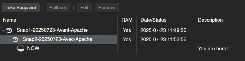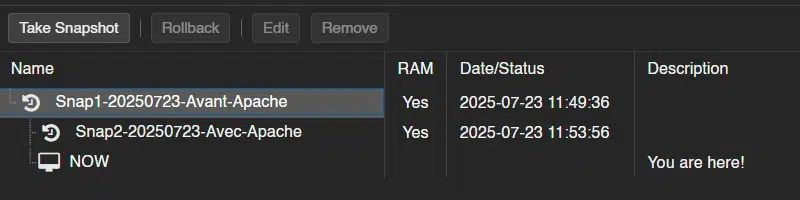 Une boîte de dialogue s'ouvrira. Vous devez alors saisir un nom, par exemple Snap1-20250723-Avant-Apache et une description. Sachez que vous pouvez créer plusieurs snapshots pour une même VM.