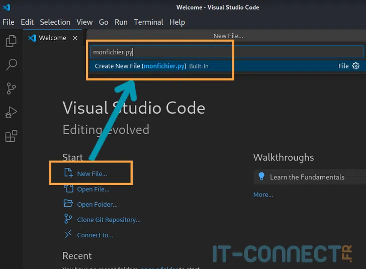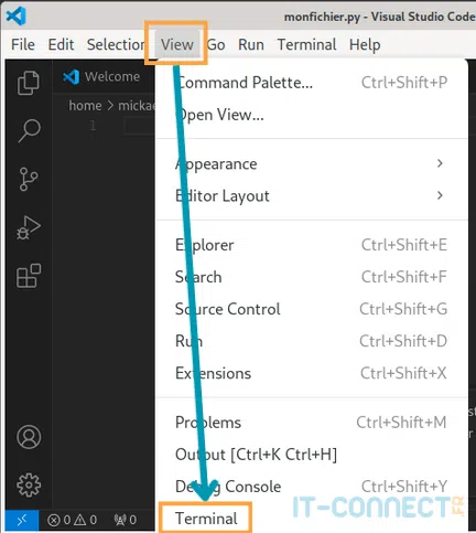 Pour de plus gros projets, vous pouvez aussi créer un répertoire dédié qui contiendra vos fichiers et modules. Je vous recommande également d’afficher le terminal qui vous permettra d’interagir rapidement et d’exécuter votre programme. Il faut pour cela se rendre dans "View > Terminal" :