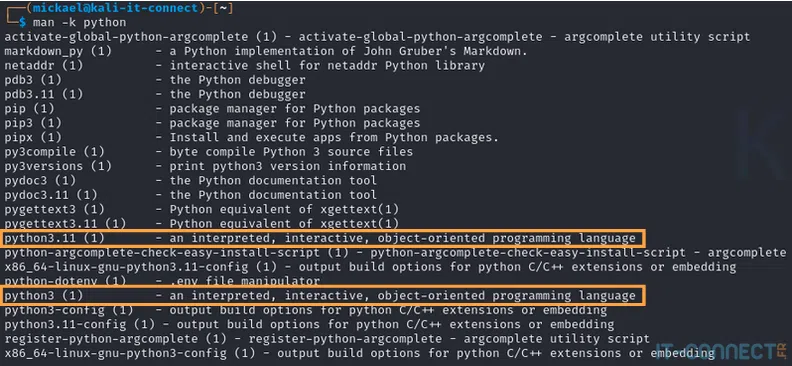 Python est installé par défaut sur toutes les distributions Linux, car il est utilisé par de nombreux programmes sur ces systèmes. Il convient toutefois de vérifier que c’est bien votre cas. Nous allons à présent ouvrir un terminal et saisir la commande suivante "man -k python".