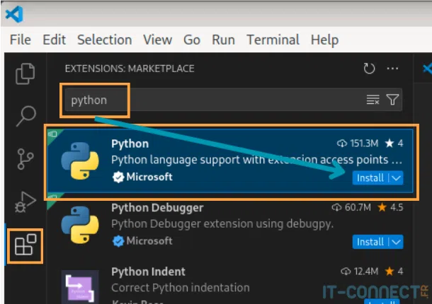 Pour pouvoir exécuter notre code plus rapidement et sans utiliser la ligne de commande, nous pouvons installer une petite extension Python pour VS Code. Il faut pour cela se rendre sur l’icône "Extensions" puis chercher "python". Vérifiez bien que le premier de la liste est celui de Microsoft avec plusieurs millions d’installations, puis cliquez sur "Install" :