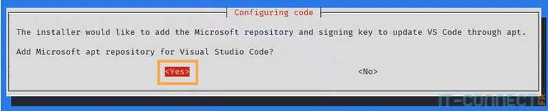 L’intérêt est de pouvoir mettre à jour Visual Studio Code en même temps que tous les autres paquets de votre distribution, je vous recommande d’accepter. Voici les informations affichées lorsque l’installation se déroule correctement :