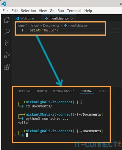 Vous aurez ensuite une fenêtre, divisez en deux, avec en haut, votre code et en bas, le terminal et espace de debug qui permet d’exécuter votre programme :