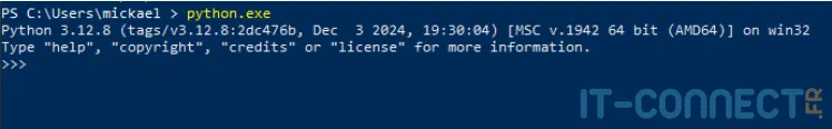Parmi tous les chemins affichés, il est important que figurent au moins les deux extraits du code ci-dessus. Si c’est bien le cas, vous pourrez exécuter la commande ”python.exe”, qui lancera un interpréteur Python3 interactif :