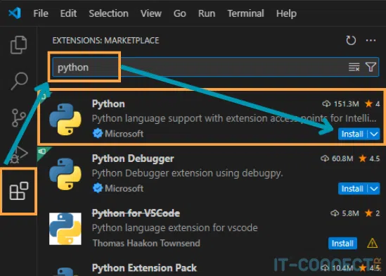Il faut se rendre dans l’onglet à gauche nommé “Extensions” (CTRL+Shift+X) et chercher “Python”. Vérifiez bien que le premier de la liste est celui de Microsoft avec plusieurs millions d’installations, puis cliquez sur “Install” :