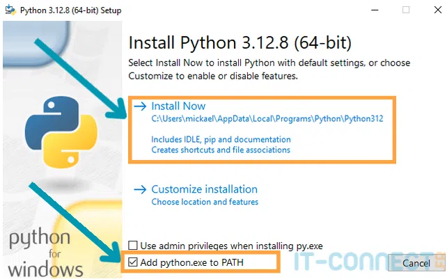 Une fois l’exécutable sur votre système, il suffit de double-cliquer dessus pour suivre la procédure habituelle d’installation sous Windows. N’oubliez pas sur la première fenêtre de cocher la cache Add python.exe to PATH. Cela permet de retrouver plus facilement l’exécutable Python depuis n’importe quel répertoire lorsque vous l’exécuterez depuis Visual Studio Code. En effet, son répertoire d'installation sera ajouté à la variable d'environnement PATH du système d'exploitation.