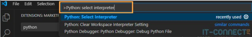 Une fois cela fait, il nous reste un petit bout de configuration à faire, saisissez le raccourci “CTRL + Shift + P”, ce qui va ouvrir la barre de recherche supérieure, puis saisissez “Python: select interpreter” :