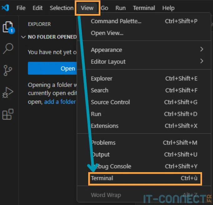 Dans le cas où la fenêtre du bas contenant les onglets “Problems”, “Output”, “Debug Console”, et “Terminal” et “Ports” n’est pas présente, il faut se rendre dans “View > Terminal” pour l’afficher, elle vous sera utile par la suite :
