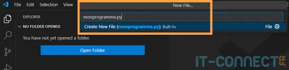Pour tester rapidement notre installation, nous pouvons créer un petit fichier via le menu “File > New File”, nommer ce fichier à l’aide de l’extension “.py” et l’enregistrer sur votre système :