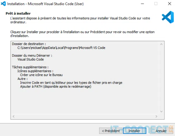 L’installation de Visual Studio Code sous Windows suis la procédure habituelle. Il faut double-cliquer sur l’exécutable, accepter l’accord de licence, choisir le répertoire d’installation, etc :