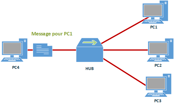 On voit ici que quand un hub reçoit un paquet, quelque soit sa destination il va le renvoyer sur tous ses ports connectés. Ainsi, on se retrouve forcément avec des cartes réseaux recevant des paquets qui ne leur sont pas destinés, générant alors des traitements supplémentaires et inutiles au niveau de ces cartes réseaux. Les cartes réseaux, étant configurées de manière à ce qu'elles n'acceptent pas les paquets n'ayant pas leur adresse MAC comme adresse MAC de destination, ont alors été pourvue de la fonctionnalité promiscious mode afin de désactiver se rejet automatique et qu'elle acceptent alors tous les paquets même si ceux ci n'ont pas leur adresse MAC comme adresse MAC de destination. Le rejet automatique ayant pour but dans un premier temps d'éviter que les ordinateurs ne fassent de traitements de paquets inutilement mais également "d'améliorer" la sécurité en faisant que chaque paquet arrive uniquement à son destinataire et non à d'autres postes.