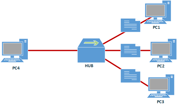 Pour comprendre le rôle et l'intérêt du promiscuous mode, il est intéressant de se replonger quelques années en arrière. Avant l'arrivée des Switchs (dit "commutateurs"), ce sont les hubs (dit "concentrateurs") qui avaient le rôle de "multiprise réseau". On connectait plusieurs postes informatiques aux hubs ainsi qu'une sortie vers un routeur, Internet ou un serveur pour que le tout puisse communiquer. Seulement les concentrateurs ne savaient pas orienter les paquets en fonction de leur adresse MAC comme le font les switchs, leur mode de fonctionnement peut être schématisé comme suivant :