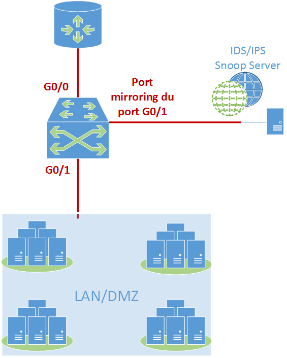 - Au niveau de la défense : Il arrive fréquemment sur les réseaux sécurisés que l'on configure un ou plusieurs ports d'un switch en mode "mirroring", le switch va alors dupliquer le trafic pour envoyer sur le port normal de destination le trafic mais également sur ce port mirroring. En général, on positionne sur ces ports mirrorring des snoop server ou IDS qui ont pour rôle d'analyser le réseau à la recherche d'élément pouvant mettre en avant un problème de sécurité, une panne ou une intrusion dans le système informatique. Ces serveurs ont alors besoin que leurs cartes réseaux aient le mode promiscious activé pour pouvoir recevoir et traiter toutes les trames qu'elles reçoivent.