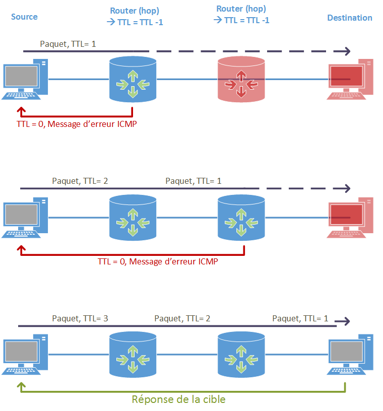 Techniquement, traceroute a un fonctionnement assez logique. Il utilise le TTL (Time To Live) des paquets UDP ou ICMP qu'il manie afin de découvrir progressivement le chemin que parcourent les paquets. Plus précisément, la source va d'abord envoyer un paquet avec un TTL de 1 qui sera décrément au premier routeur (dit aussi "saut" ou "hop") qui jettera alors le paquet puis enverra à la source du paquet un message d'erreur ICMP disant "Time to live exceeded in transit" . Notre source fera ensuite la même chose avec un TTL de 2. Arrivé à notre cible finale, celle-ci nous répondra un paquet. Voici un schéma qui vous permettra de mieux comprendre ce processus :