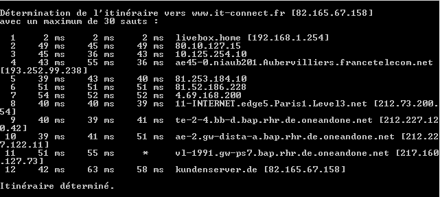 Pour que ce soit parlant, voici un exemple de résultat de traceroute sous Windows (commande "tracert"):