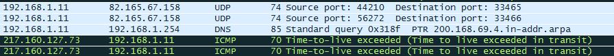 On voit bien la trame 84 qui effectue un ping avec un TTL de 1 puis la trame 85 qui décrémente le TTL et qui renvoie un "TTL exceeded" en retour avec l'IP source (du routeur donc) "192.168.1.254". On remarque ensuite une requête DNS sur 254.1.168.192.in-addr-arpa qui ressemble donc à un nslookup inversé (partant de l'IP pour arriver au nom). On a ensuite la réponse du serveur DNS (qui ici a la même IP que mon routeur puisqu'il s'agit de ma livebox)