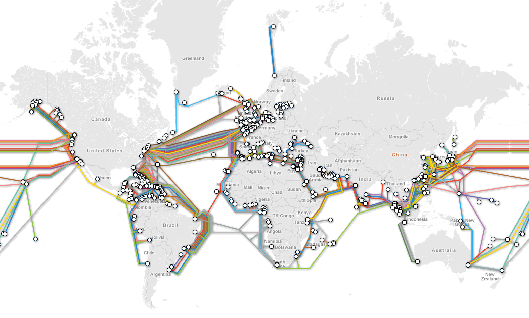 Ici, on voit que certains éléments sont redondés sur le réseau, néanmoins, on remarque qu'un seul point est utilisé pour aller sur Internet, si ce point tombe, aucun autre n'est présent pour prendre le relais, le SPOF dans ce schéma est donc le routeur qui lie le LAN à Internet. Ce qui est intéressant, c'est que les SPOF ne sont pas spécifiques aux réseaux, il faut avoir un point de vue général du SI pour essayer d'identifier tous les SPOF possibles... Les SPOF peuvent être identifiés tout au long d'une chaîne de traitement ou de circulation d'un flux, c'est ce qui fait que les SPOF requièrent une attention particulière au sein des SI ainsi qu'une connaissance précise de ceux-ci. Pour illustrer le contournement d'un SPOF, voici la dernière carte parue identifiant les câbles réseau sous-marins reliant les différents continents entre eux au niveau d'Internet.