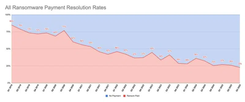 Selon le dernier rapport de Coveware, seulement 23 % des victimes de ransomware ont pris la décision de payer une rançon au troisième trimestre 2025. Même si c'est toujours trop, c'est un niveau historiquement bas.