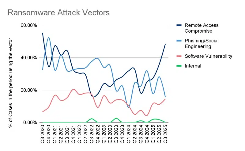 "Les attaques de ransomware au troisième trimestre sont restées largement opportunistes, motivées par les points d'entrée les plus accessibles : vulnérabilités non corrigées, accès à distance exposé ou identifiants compromis. Les acteurs de la menace continuent d'exploiter les technologies communes et les mauvaises configurations plutôt que de cibler des industries spécifiques, en se concentrant plutôt sur l'échelle et la facilité d'accès.", précise le rapport.