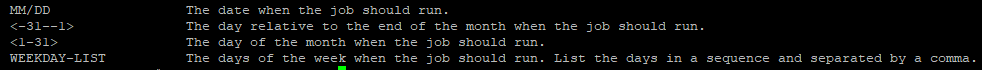 Pour revenir à la commande job, si l'on veut exécuter une tâche uniquement le 1er de chaque mois, ou uniquement le mercredi et le samedi, etc... il faudra être plus précis et inclure la directive "on".