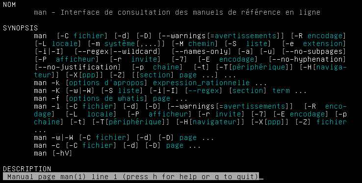 Nous connaissons déjà la commande man que nous vous avions déjà présenté brièvement ici (La commande man), celle-ci comporte une option qui présente la fonctionnalité que nous voulons, si on fait la commande suivante :