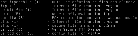 On voit que l'option "-k" permet d'inclure des expressions régulières " à propos" de ce que l'on cherche. Par exemple si l'on cherche les commandes relatives à l'utilisation du FTP, on utilisera la commande MAN comme suivant :