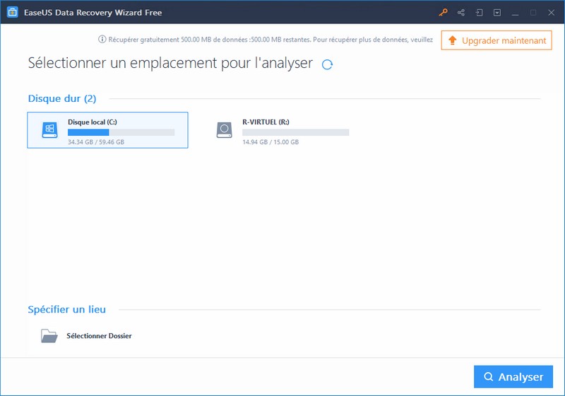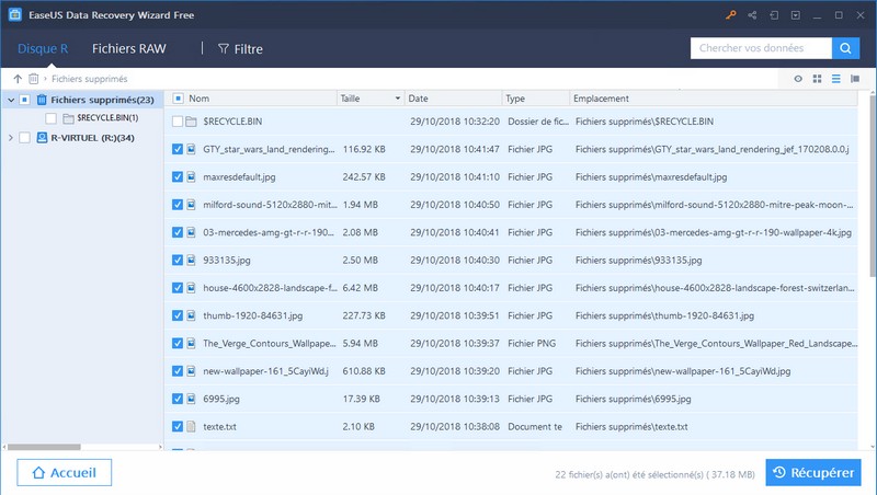 J'ai supprimé l'intégralité des données de la partition et vidé la corbeille. Il y a des fichiers de différents types : image, CSV, PDF, visio, et txt. Maintenant, passons à la phase de récupération des données avec le logiciel EaseUS. Le logiciel s'utilise de façon très simple : lorsqu'il s'ouvre, il nous propose de sélectionner un emplacement à analyser. Dans mon cas, je vais sélectionner le disque "R" et lancer l'analyse.