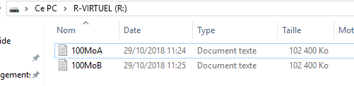 Maintenant, j'ai fait un autre test : j'ai remis mes données sur la partition "R", je les ai supprimées, ensuite j'ai créé à plusieurs reprises des fichiers de 100 Mo sur cette même partition. Le but étant de réécrire des données à la place de celles écrasées.