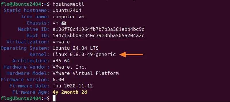 La ligne "Kernel" indique le numéro de version du noyau, tandis que nous avons d'autres informations intéressantes, comme l'OS utilisé, ici "Ubuntu 24.04 LTS".