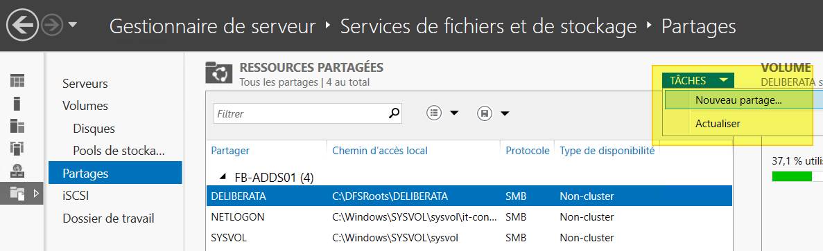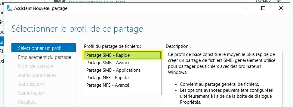 Dans la console "Gestionnaire de serveur", accédez à "Services de fichiers et de stockage" (vous devez installer la fonctionnalité) et ensuite créez un nouveau partage, comme ceci :