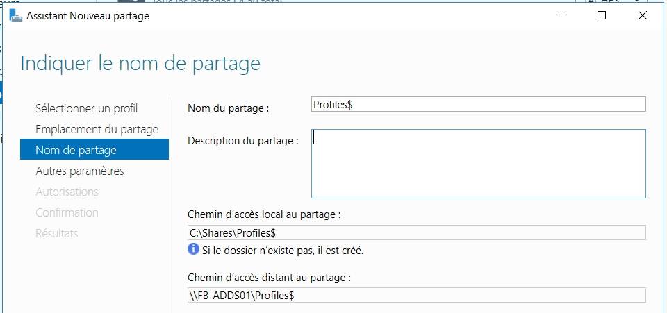 Donnez un nom à votre partage, par exemple : Profiles$. Ce partage étant sensible et qu'il n'y a pas lieu d'y accéder en direct, notamment via la découverte réseau, je vous recommande de mettre un "$" à la fin du nom pour qu'il soit masqué un minimum.