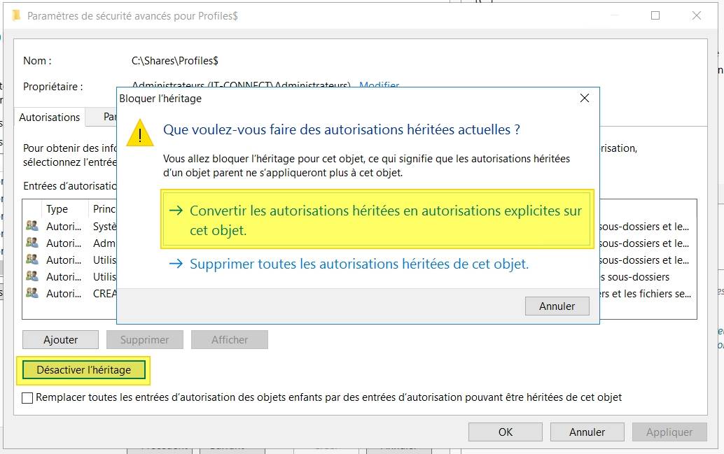 Commencez par cliquer sur "Désactiver l'héritage" et cliquez sur "Convertir les autorisations héritées en autorisations explicites sur cet objet" pour récupérer les droits actuels. Nous allons les faire évoluer.