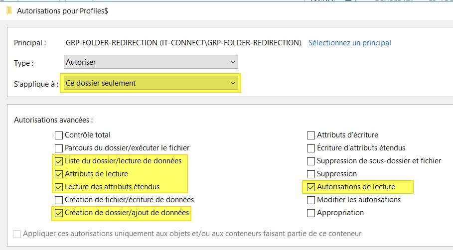 Maintenant, ajoutez des autorisations pour le groupe "GRP-FOLDER-REDIRECTION" et configurez comme ceci :