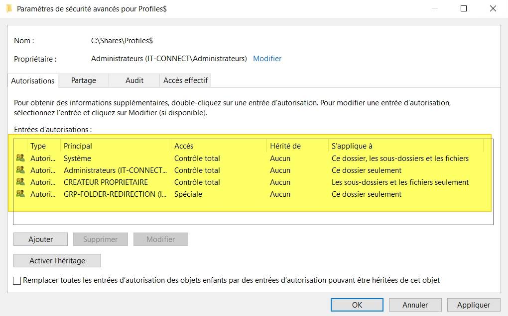 Il faut maintenant passer à l'étape la plus délicate : les autorisations NTFS. Nous allons donner les bons droits sur le partage afin que, lorsqu'un utilisateur se connecte, un dossier de profil puisse être généré (le nom sera son identifiant AD) et qu'il puisse écrire dans ce dossier. Il aura les droits exclusifs sur le dossier de son profil (+ l'administrateur) et ne pourra pas accéder aux autres dossiers de profils.