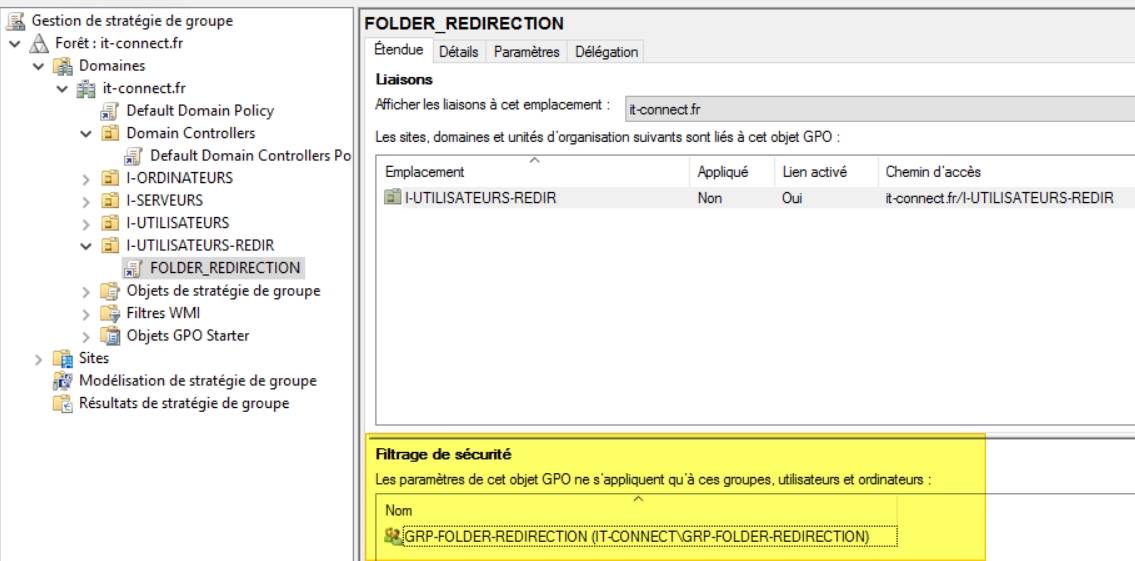 Avant de procéder aux tests, nous devons créer la GPO et la configurer. Via la console "Gestion de stratégie de groupe", créez une nouvelle GPO nommée "FOLDER_REDIRECTION" (par exemple) et modifiez le filtrage de sécurité pour qu'il y ait le groupe "GRP-FOLDER-REDIRECTION" seulement, comme ceci :