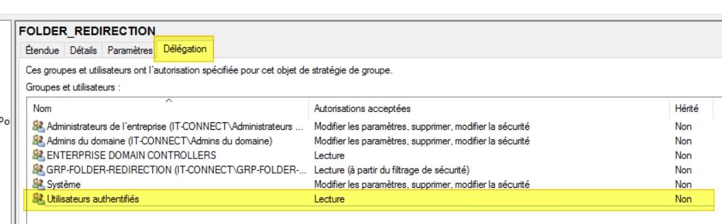 Suite à une mise à jour publiée par Microsoft (MS16-072), il y a eu des changements au niveau de la sécurité et pour que la redirection de profils fonctionne, vous devez ajouter le groupe "Utilisateurs authentifiés" en "Lecture" dans l'onglet "Délégation" :