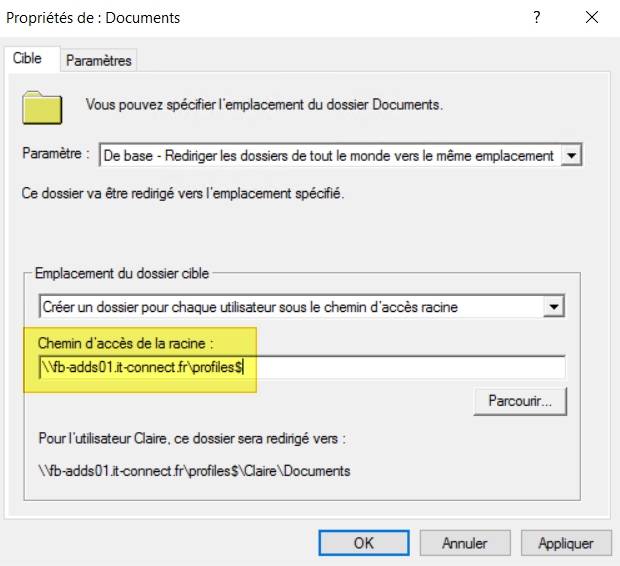Choisissez l'option "Créer un dossier pour chaque utilisateur le chemin d'accès racine", ce qui rejoins ce que je disais précédemment : à la racine du partage des profils, un dossier va être créé pour l'utilisateur et dans ce dossier, il y aura un dossier "Documents".