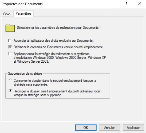 J’ai donc suivi ce tuto afin de paramétrer la redirection des documents de nos utilisateurs.