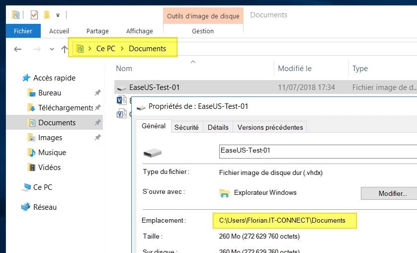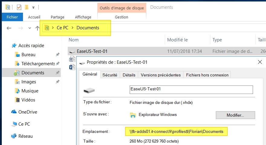 Pour ma part, je passe donc sur un poste client Windows 10 pour tester la redirection de dossiers. Actuellement, on peut voir quand lorsque je regarde les propriétés d'un fichier dans "Documents", il est stocké en local comme le confirme l'emplacement.