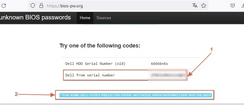 On se rend alors sur la page d’accueil du site de bios-pw via un autre appareil connecté à internet. On y insère le numéro de série du Laptop qui est généralement de la forme « 1234567-595B » pour DELL avec des caractères généralement alphanumériques, puis on clique sur le bouton « Get password ».