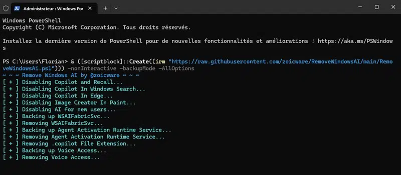 Ici, j'ai utilisé deux options spécifiques : -backupMode pour effectuer une sauvegarde des fichiers IA avant leur suppression et -AllOptions pour un nettoyage complet. D'autres options sont disponibles et documentées sur le GitHub du projet (-PreventAIPackageReinstall, -RemoveAppxPackages, etc.). Cela peut être intéressant pour être moins agressif dans la suppression.