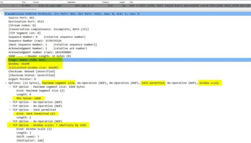 Concernant l’option « Windows scale » Wireshark indique qui faut multiplier par 256 la valeur qui se situe dans « Window » qui est égal à 64240 octets. Enfin, la dernière option activée est « SACK permitted ».
