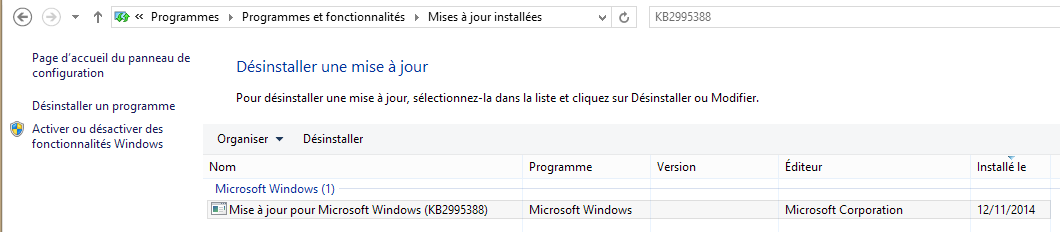 Dans le filtre de recherche présent en haut à droite de l'explorateur Windows, il faut saisir "KB2995388" pour rechercher cette mise à jour qui est celle rentrant en conflit avec Workstation et qui cause l'affichage de cette erreur :