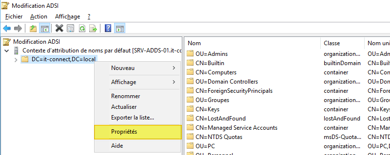 Pour les personnes plus à l'aise avec l'interface graphique, ouvrez "adsiedit.msc" (Modification ADSI) sur votre serveur. Effectuez un clic droit sur la racine de votre domaine, en étant avec le mode "Contexte d'attribution de noms par défaut" et cliquez sur "Propriétés".